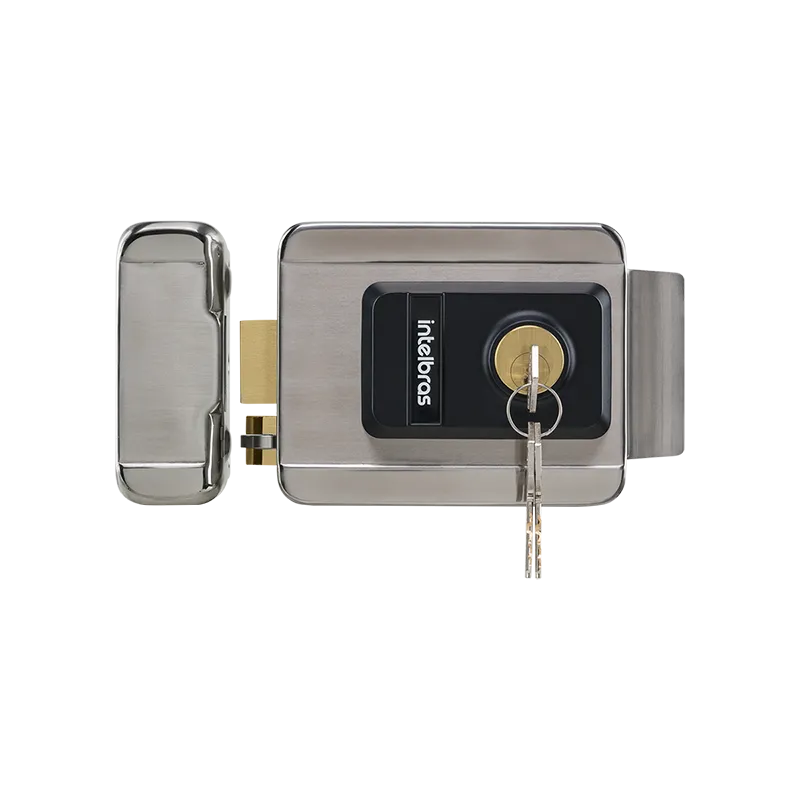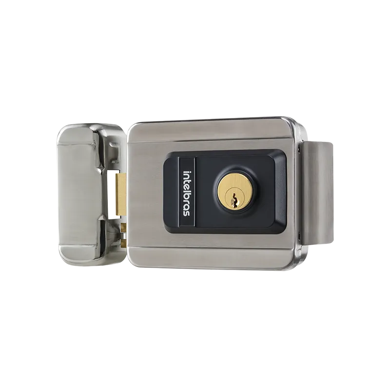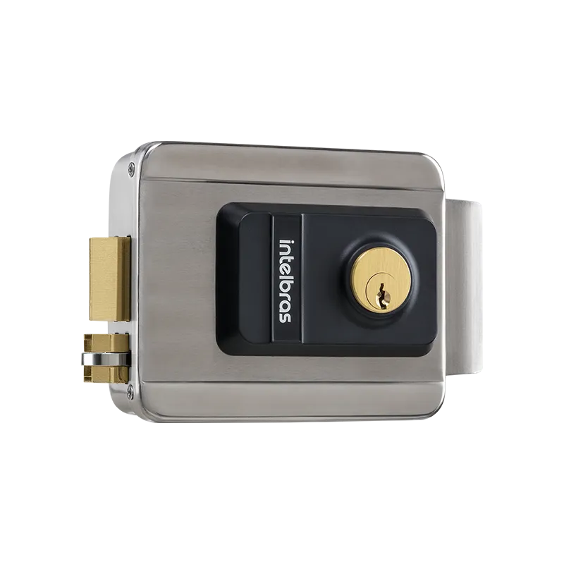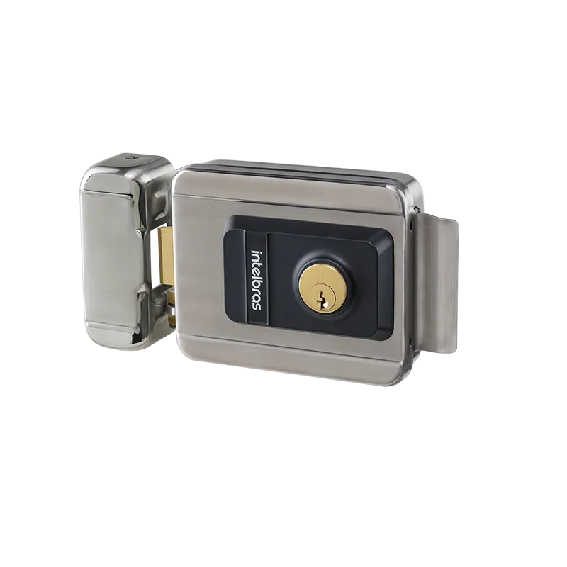 Cerradura eléctrica de sobreponer en acero inoxidable, diseñada para puertas y portones con apertura hacia dentro o fuera. Alta resistencia, instalación versátil y compatible con sistemas de videoportero y control de acceso Intelbras.