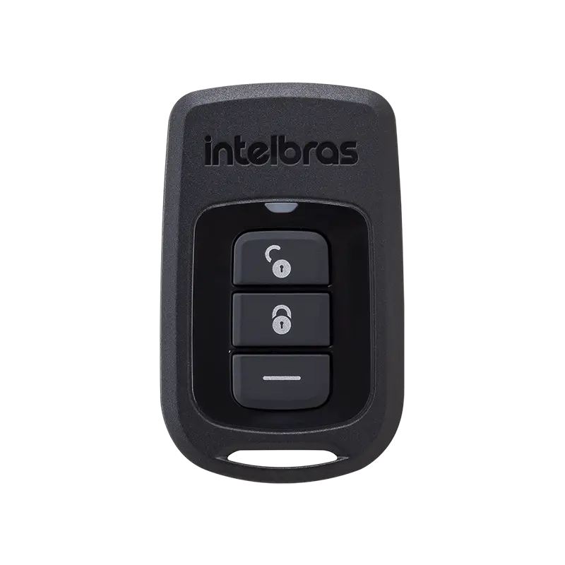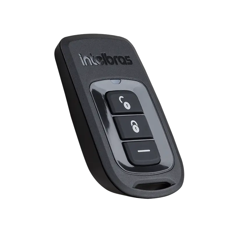 Control remoto compacto con 3 botones independientes, permite activar, desactivar y ejecutar funciones del panel AMT 8000 EXP.
