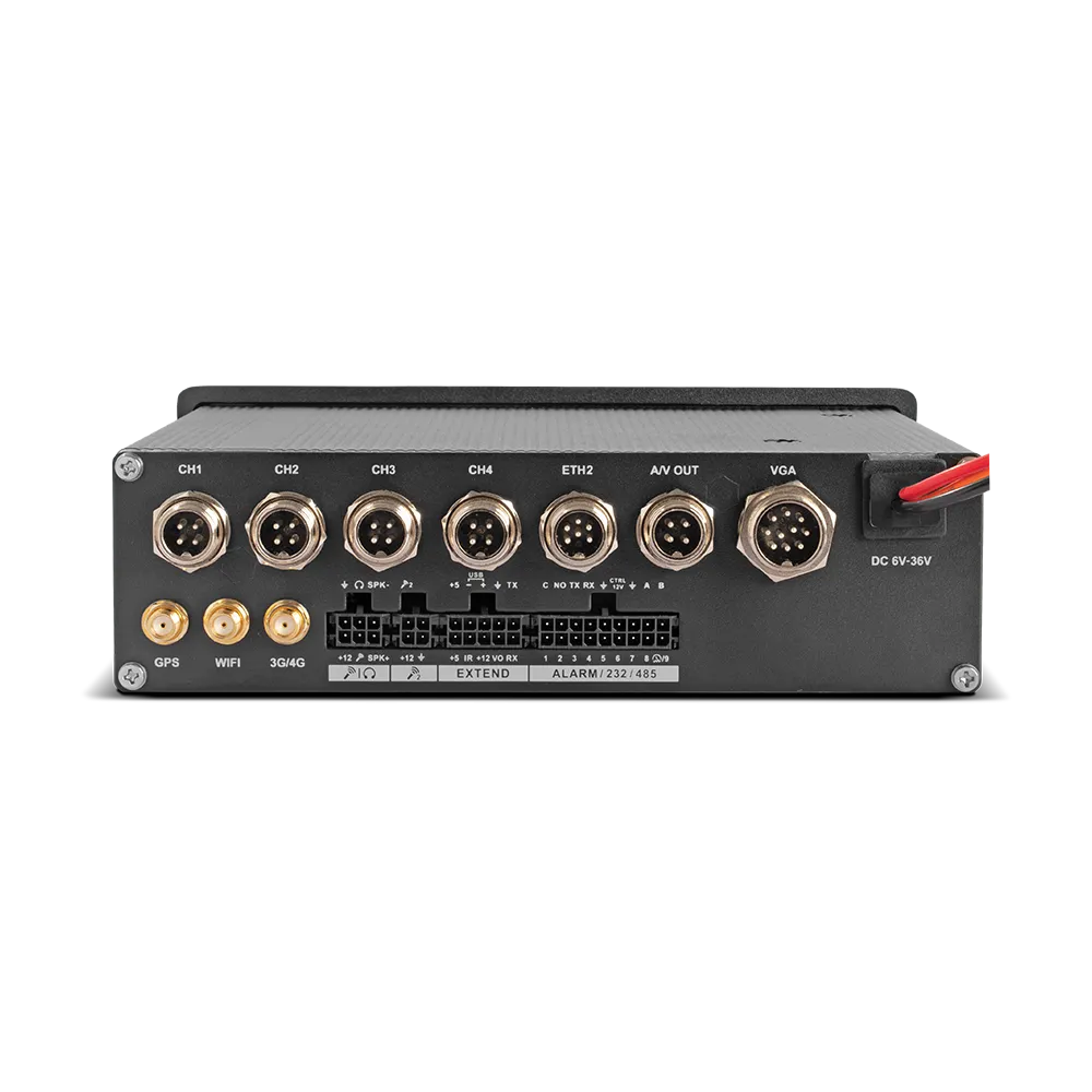 • DVR vehicular 4 canales Multi‑HD 1080p + 4 canales IP (hasta 4 MP) con módulo 4G/LTE, Wi‑Fi, GPS y acelerómetro, resistente a vibraciones.